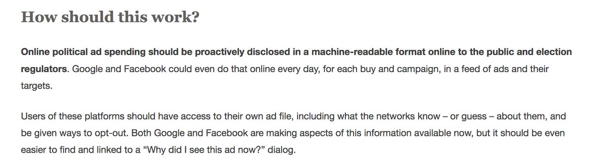 Real transparency at @facebook: a public file of all paid political ads, on a public website with bulk #opendata downloads & an API, none of which require the public to log into @Facebook.