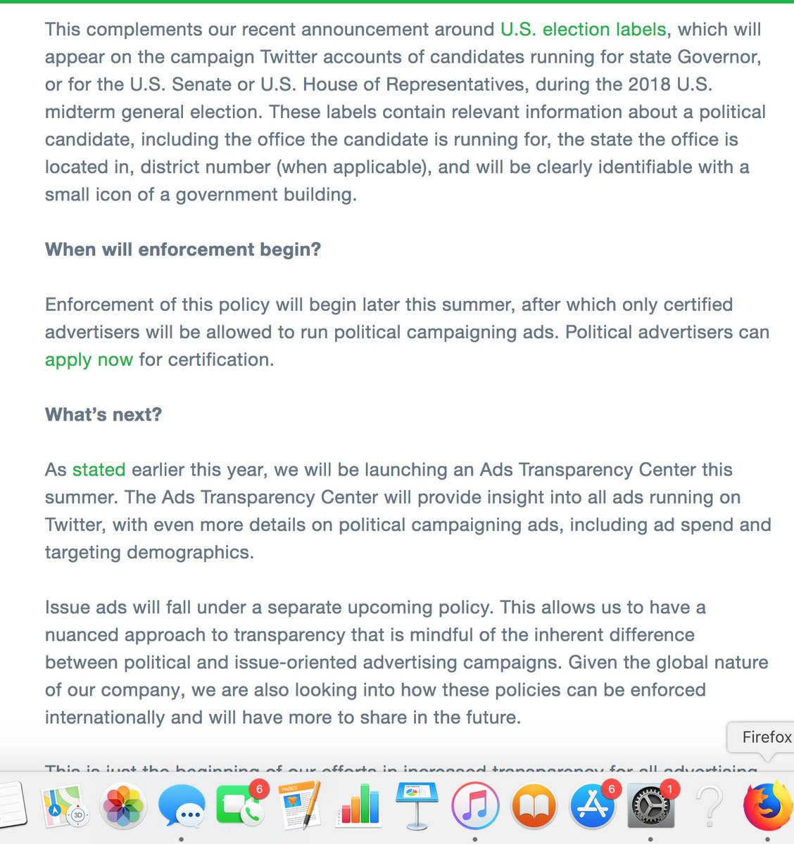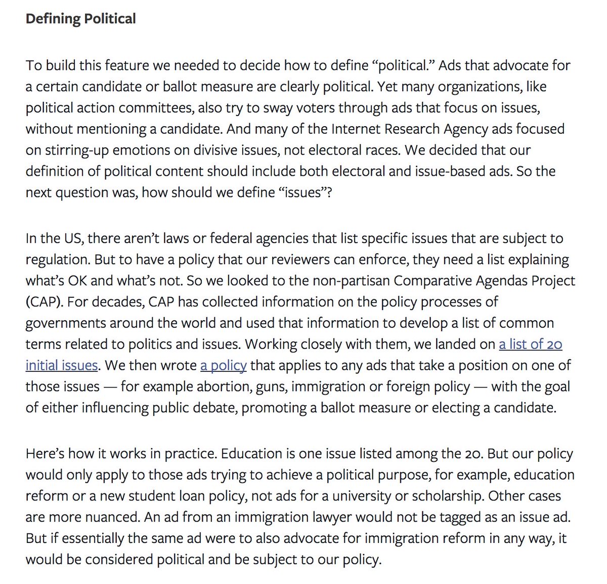 @Facebook is finally explicitly embracing political ad transparency in words & (some) deeds, including public soul searching about what's political & a policy: https://newsroom.fb.com/news/2018/05/hard-questions-political-ads/ … That's progress. It's just long overdue.pic.twitter.com/p99Tj0FjiS