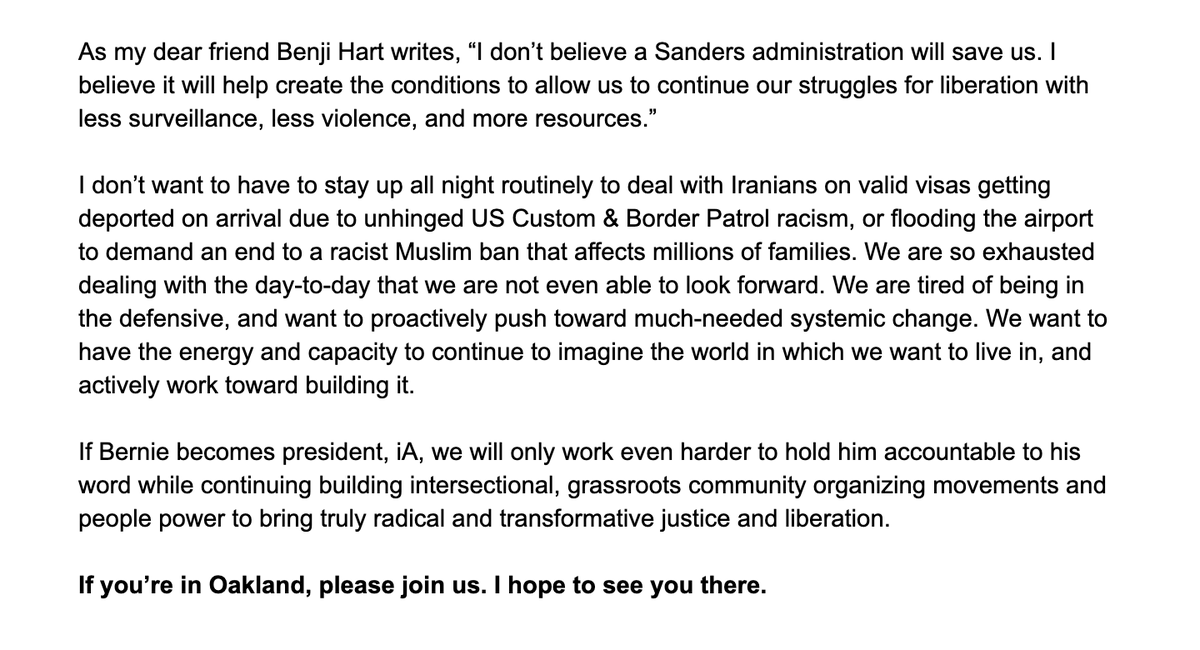 2/I will come out to vote for Bernie Sanders in both the primary and, inshAllah, for president, as I believe that it is under his presidency alone that our communities will have the best ability to further our battles on the ground for justice and liberation.
