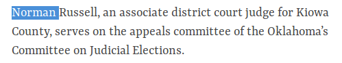Norman sat on the bench as associate district court judge of Kiowa County until January 2019, and serves on the appeals committee of the Oklahoma Committee on Judicial Elections. His bar is still active.
