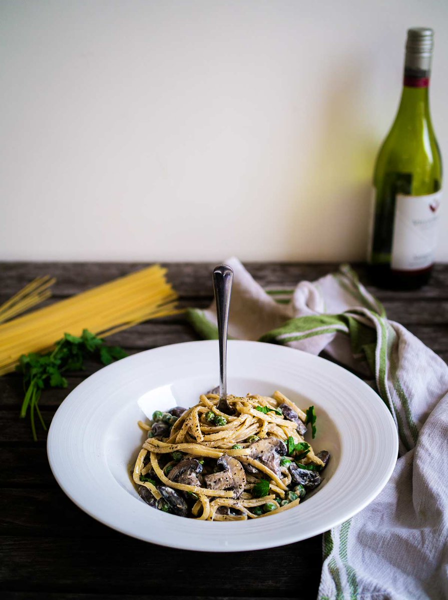 Creamy Mushroom Linguine w/ peas & silken tofu sauce - recipe live! Warming, creamy, comforting. Link: http://www.discoverdelicious.org/food-blog/creamy-mushroom-linguine …