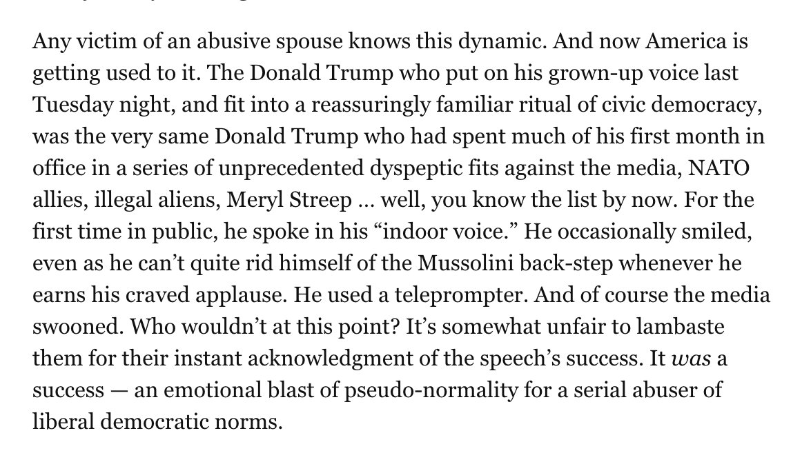 New from Andrew: "Any victim of an abusive spouse knows this dynamic. And now America is getting used to it." http://nymag.com/daily/intelligencer/2017/03/andrew-sullivan-our-presidents-emotional-bait-and-switch.html …pic.twitter.com/3BrXWjKjXz