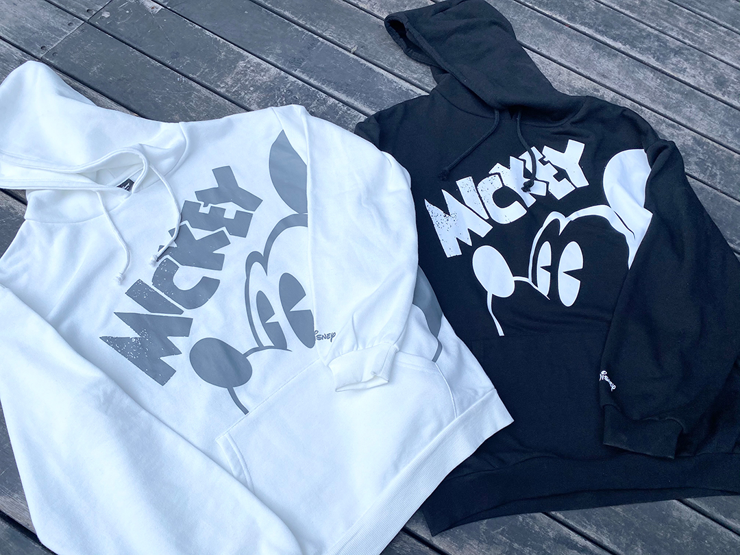 #ミッキーマウス の顔が大きくプリントされたパーカーが登場