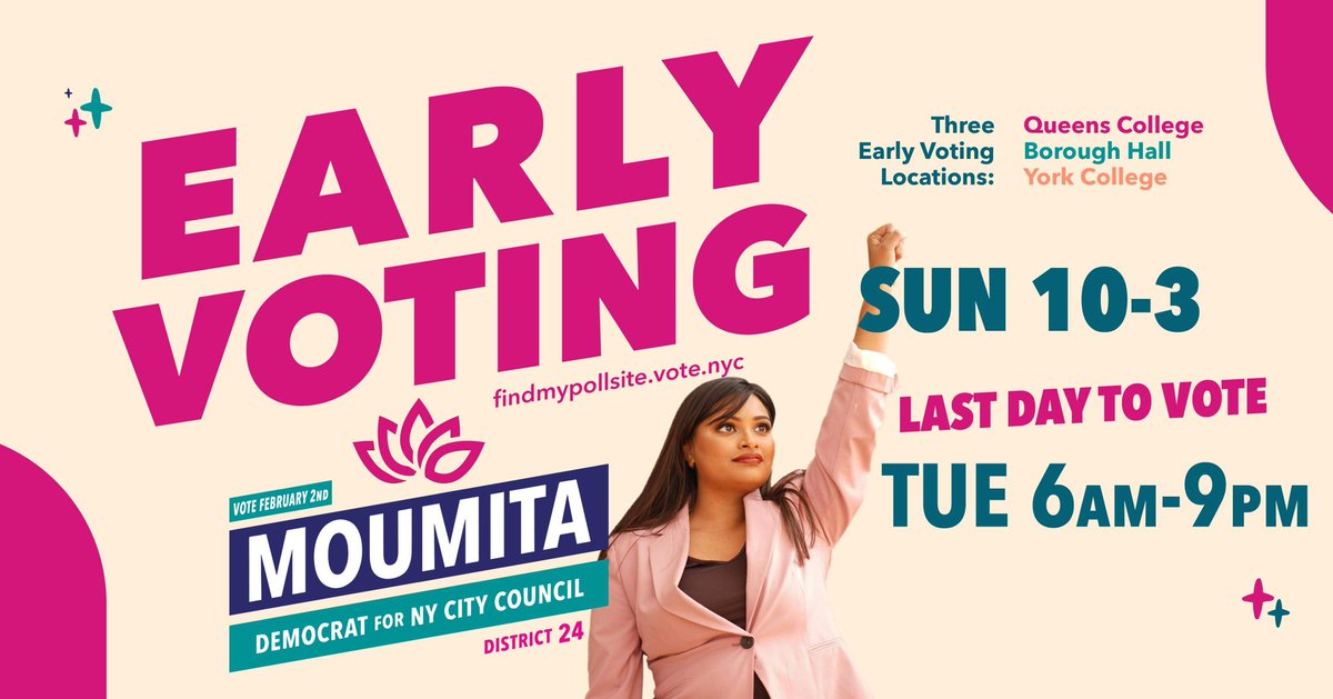 Today is the LAST DAY of early voting! A major snowstorm is forecast for tomorrow. Find your early voting location here and vote today before 3pm: http://findmypollsite.vote.nyc pic.twitter.com/TVxKr2zP1m