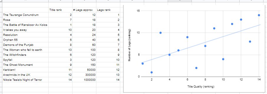 In case anyone wonders what I spend my free time doing: Here's a plot of title quality versus total leg count in