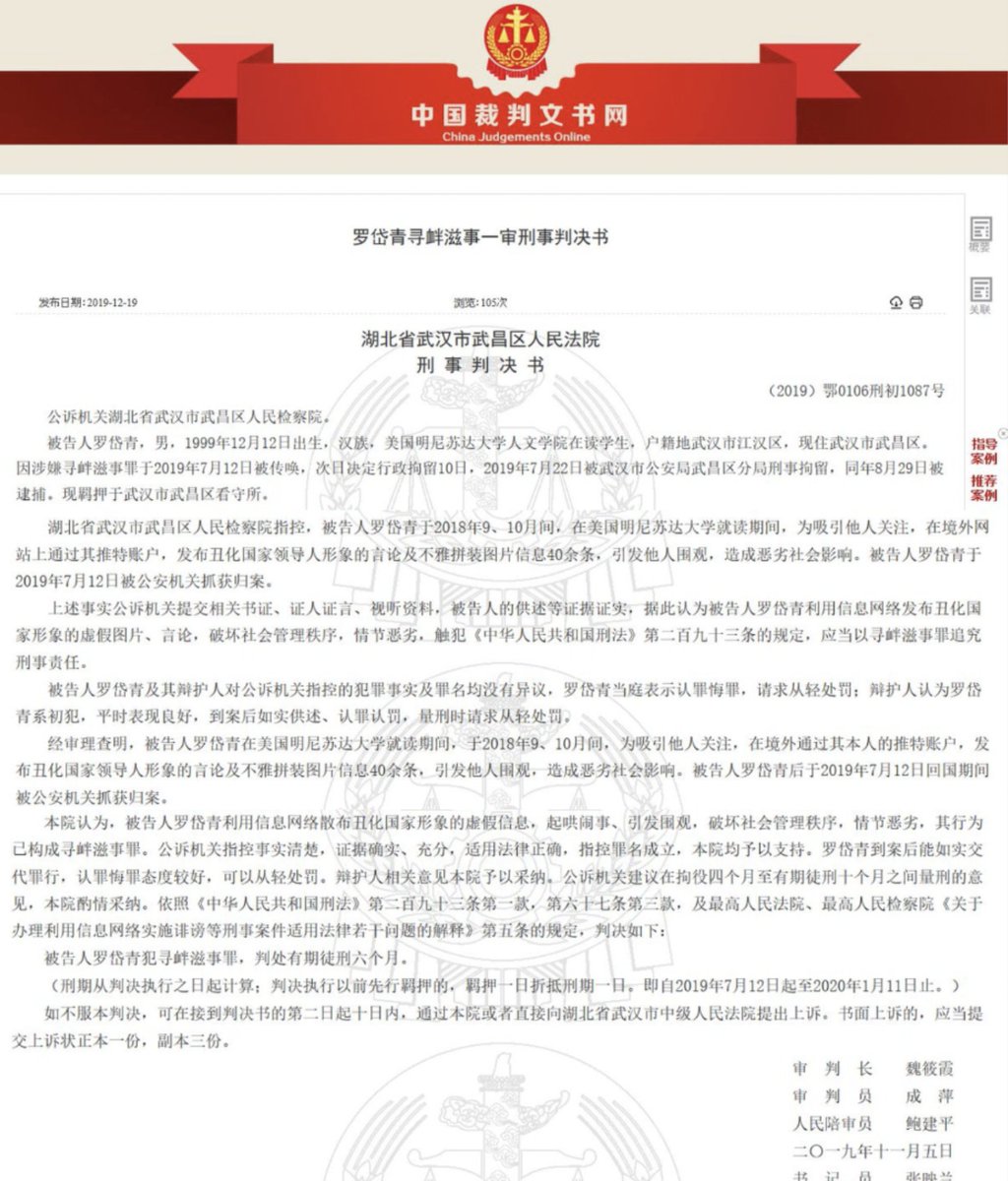 Luo Daiqing 罗贷青, a Chinese student studying at the University of Minnesota, was sentenced for half a year in Wuhan China, because of his posts defaming National leader on Twitter.pic.twitter.com/o4bPVH9oG1