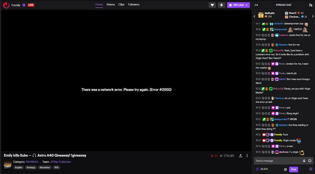 Hey @virginmedia, is there any reason your customers can't currently watch anything on @Twitch, but the rest of your service seems to be working "as intended"? This stream is live, a lot of people are watching fine, but as you can see in the chat, VirginMedia customers cannot.pic.twitter.com/VJ0VVltoAv