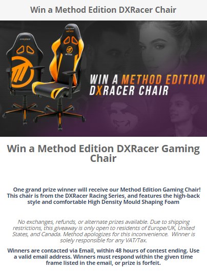 There is FIVE hours left to enter the giveaway at http://www.method.gg/giveaway for a Method branded @DXRacer chair!pic.twitter.com/JpcdfhwKp2
