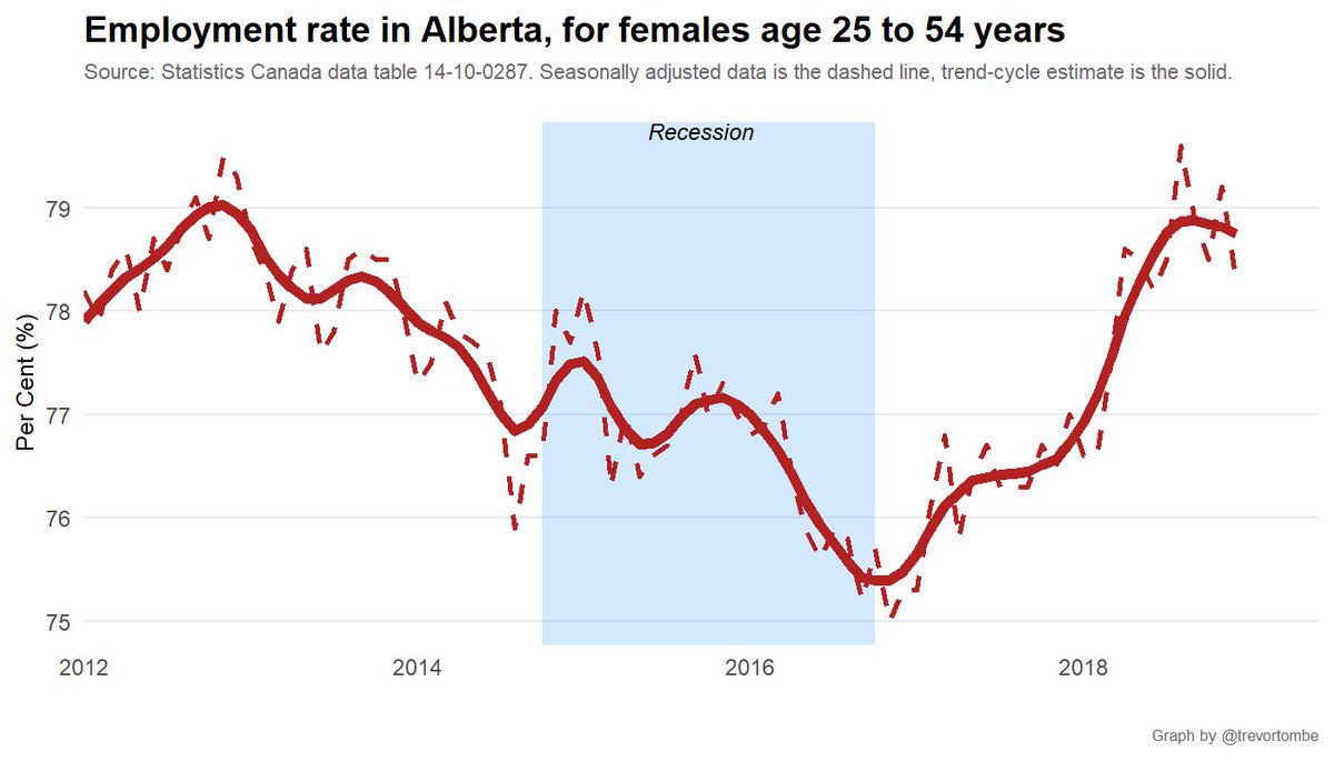 Alberta's economic recovery has been particularly strong for women. For those aged 25-54, more are employed (as a % of pop) than before recession.