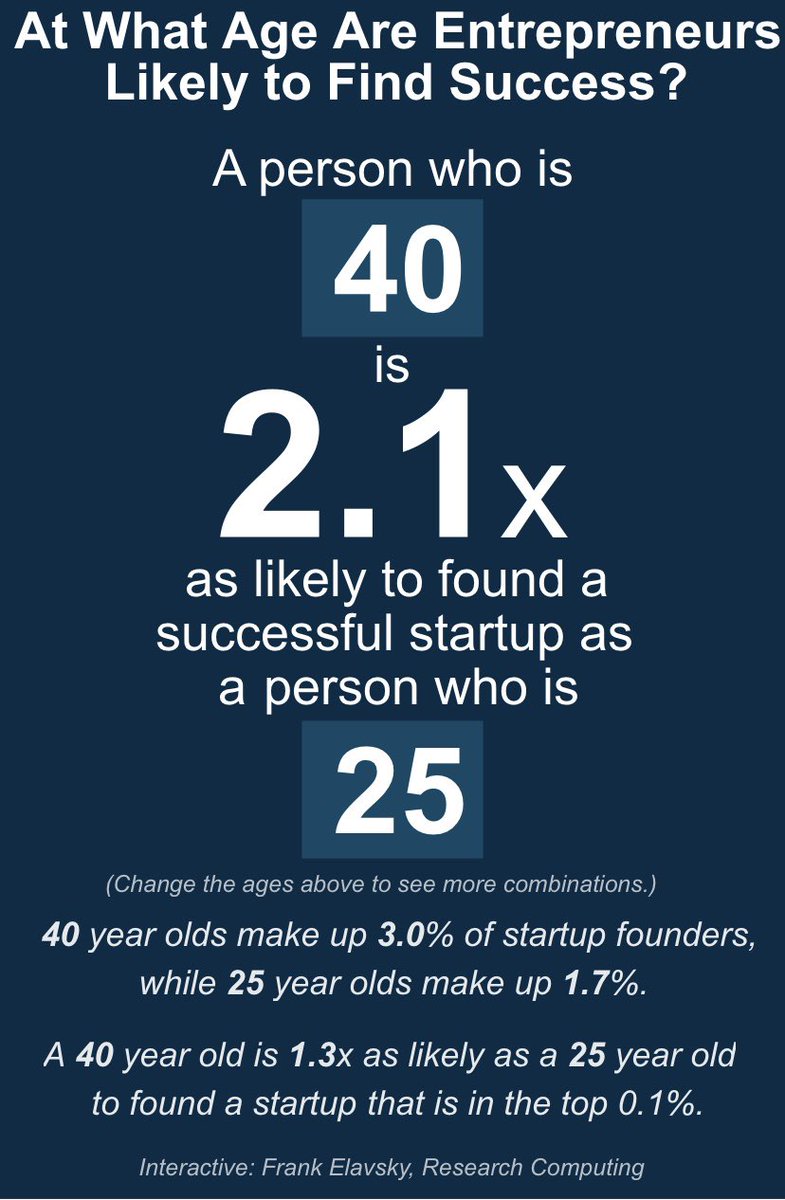 40+ year old entrepreneurs more likely to succeed! Entrepreneurs Get Better with Age! https://insight.kellogg.northwestern.edu/article/younger-older-tech-entrepreneurs …pic.twitter.com/eEenZhE0VV
