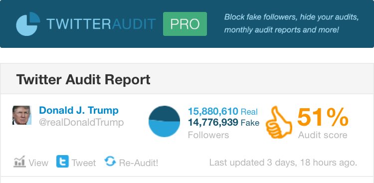 Trump has an unusually high proportion of fake followers. https://www.twitteraudit.com/realdonaldtrump pic.twitter.com/tnhPBOJC9n
