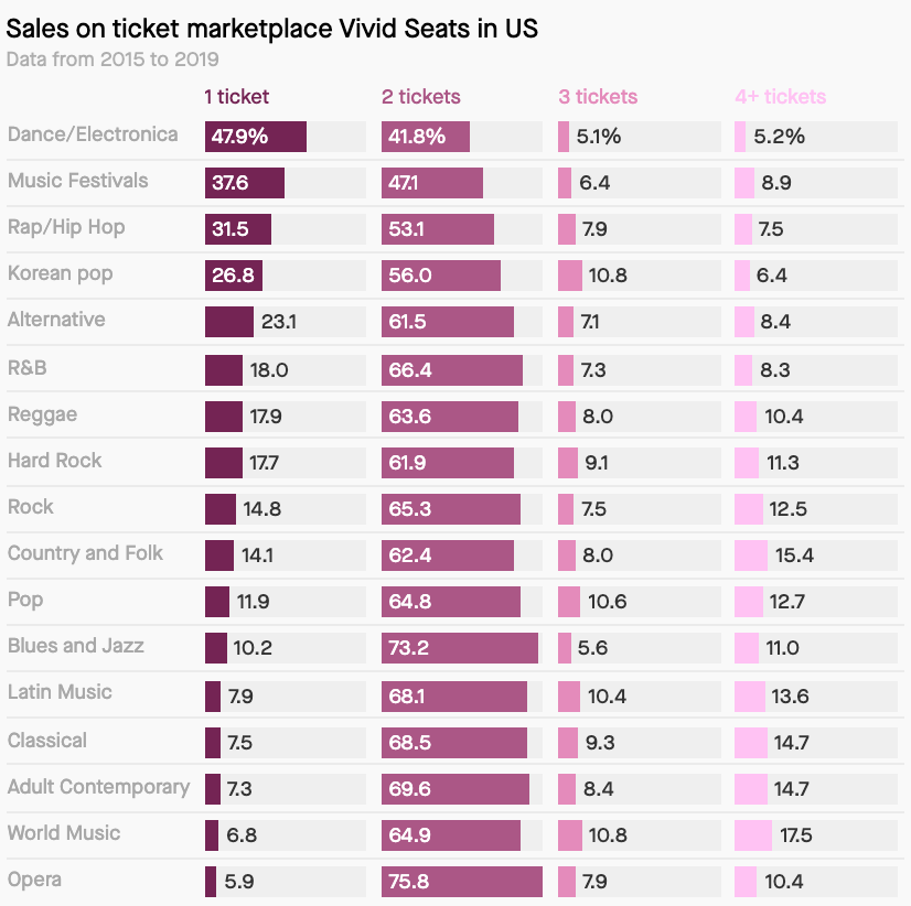 People go to hip-hop concerts alone and country music concerts in groups. https://qz.com/1780599 by