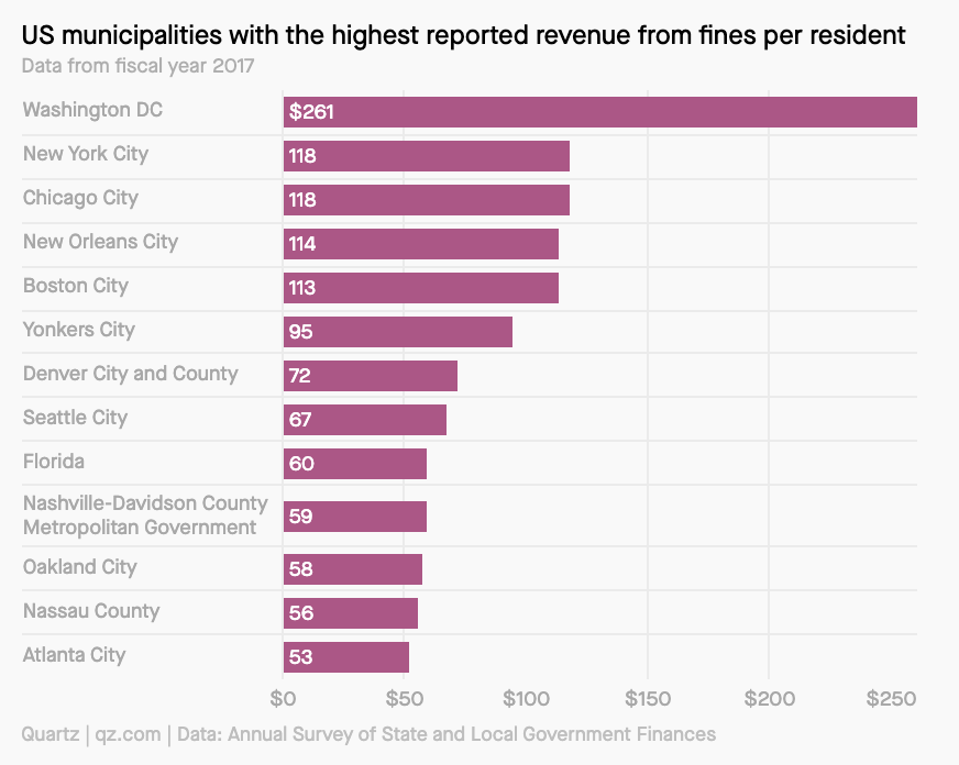 At $261 per person, Washington, D.C. assesses more fines and fees than any other American locality. But it's not just DC -- NYC, Chicago, New Orleans, and Boston all assessed more than $100 in fines per person in 2017. https://qz.com/1789851/no-us-city-fines-people-like-washington-dc/ …