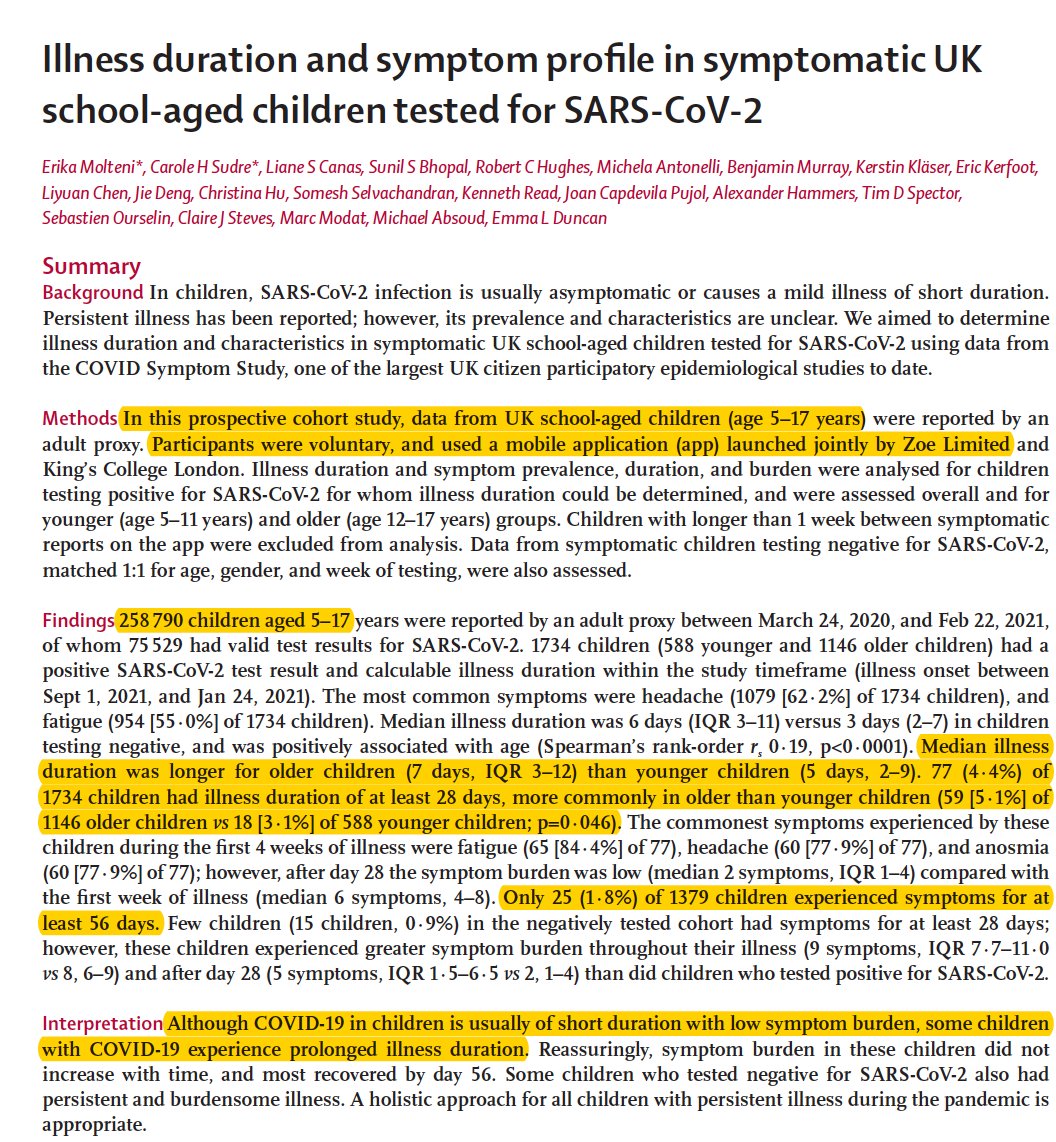 @LancetChildAdol is a very reassuring prospective study of >250,000 children, >1700 with + covid test, age 5-17, that shows the risk for chronic Covid symptoms is quite low; 4.4% beyond 4 weeks https://www.thelancet.com/journals/lanchi/article/PIIS2352-4642(21)00198-X/fulltext …pic.twitter.com/XBVH5wmFve