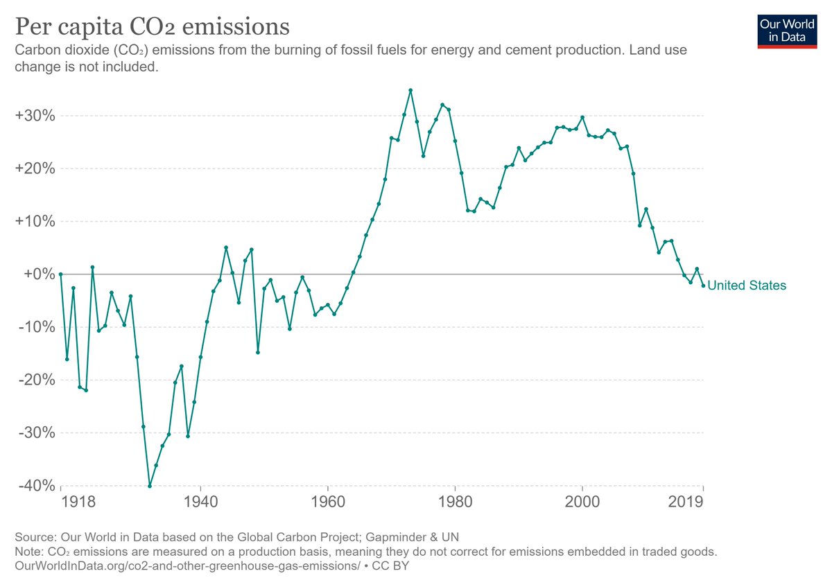 U.S. per capita carbon emissions are lower now than in 1918. https://ourworldindata.org/grapher/co-emissions-per-capita?tab=chart&stackMode=relative&time=1918..latest&country=~USA …pic.twitter.com/sbkmemHB4c