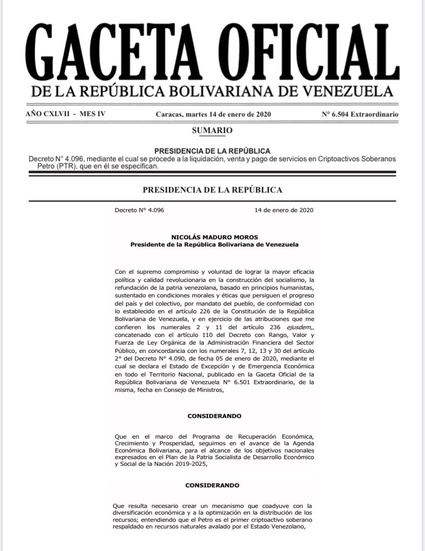 Decree No.4,096 has been published in Official Gazette No.6,504 Extraordinary dated 14 January 2020, making it compulsory the payment in Petro (the so-called domestic crypto currency) of various port services provided by Bolipuertos, S.A. and maritime authority INEA...pic.twitter.com/xSrxfzMyXK