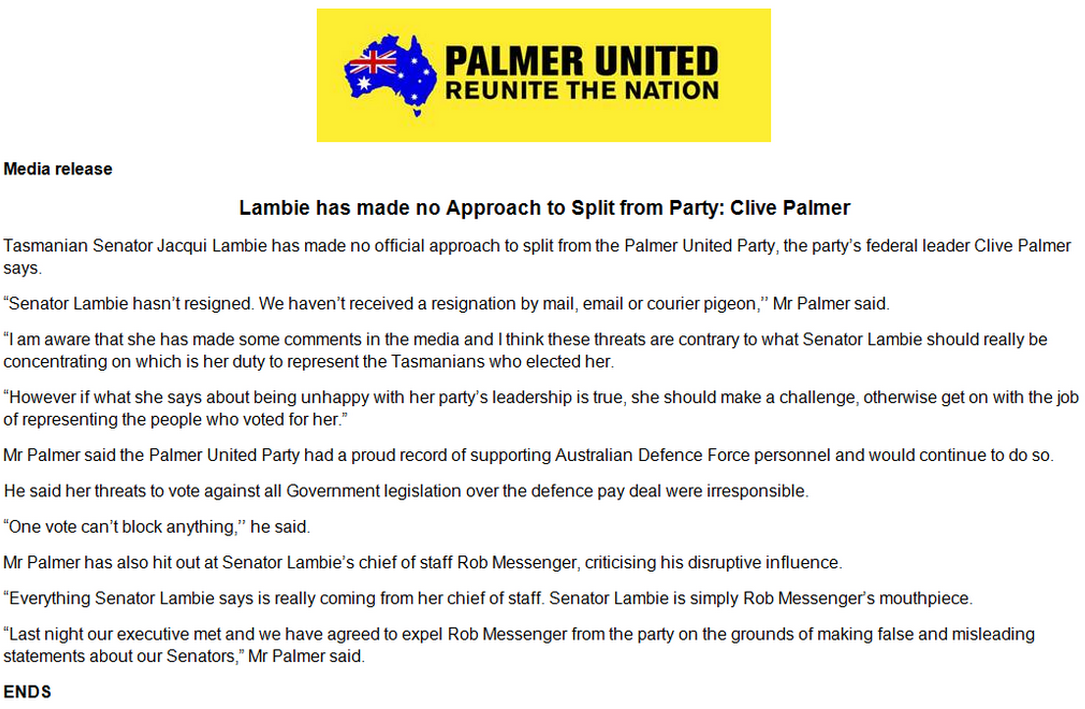 Jacqui Lambie's COS Rob Messenger has been expelled from @PalmerUtdParty overnight. Wow. #auspol #politaspic.twitter.com/pCVuygIMMx