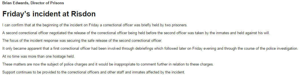 Tasmanian Prisons director Brian Edwards confirms two guards were held hostage at #Risdon on Friday. Full statement:pic.twitter.com/HNqiYEcXXu