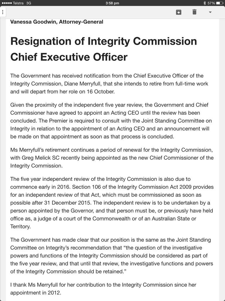 Timing of Diane Merryful's resignation unfortunate, given (very) recent IC report on Tas Public Service gift procedures