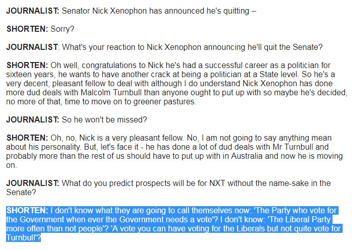 Trouble with Nick Xenophon is he talks like Labor, votes like Liberal.