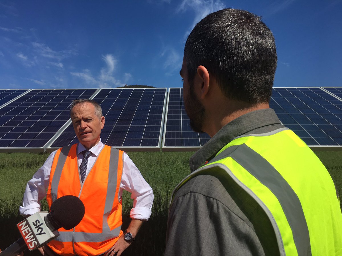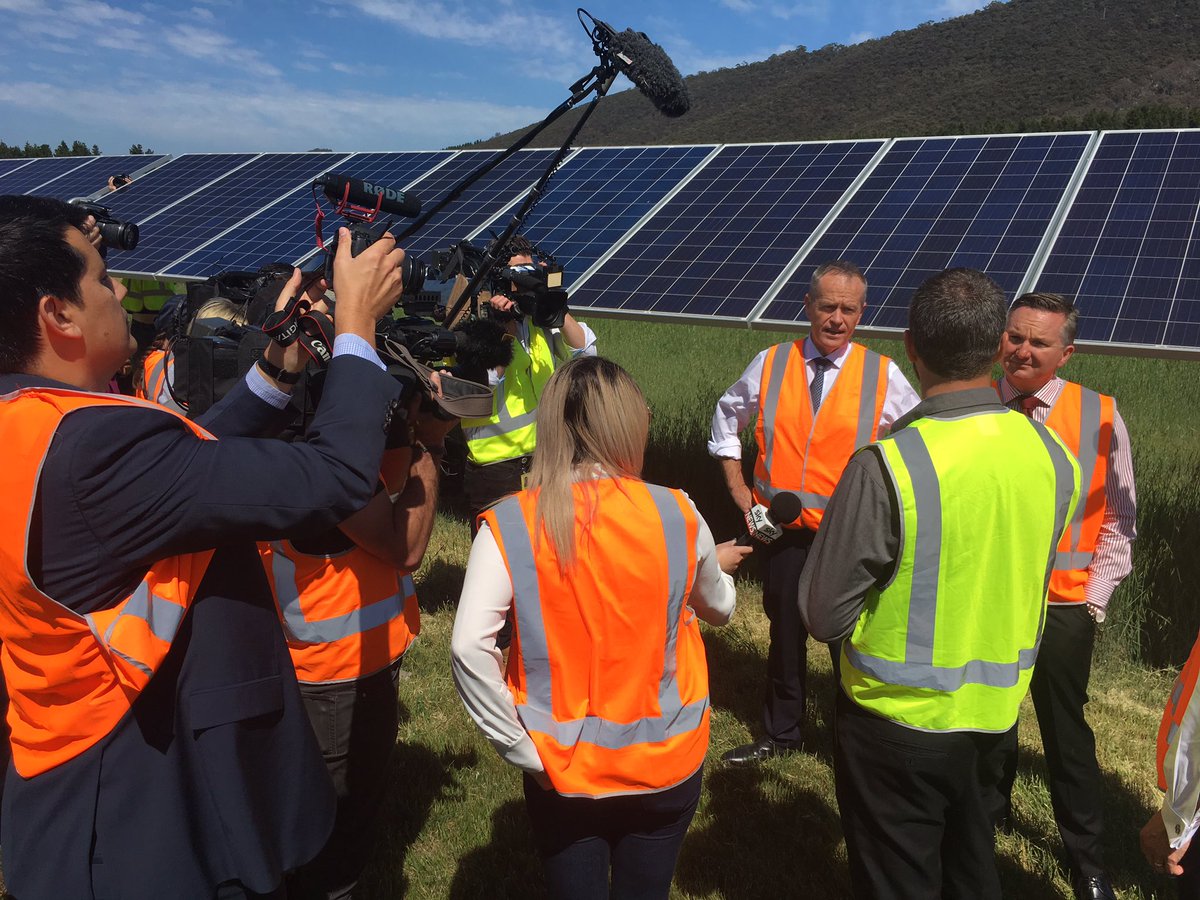 Bill Shorten, Labor colleagues and a rolling maul of media folk take a turn around a Canberra solar farm to talk climate and energy. #auspolpic.twitter.com/MVvRJ4l4df