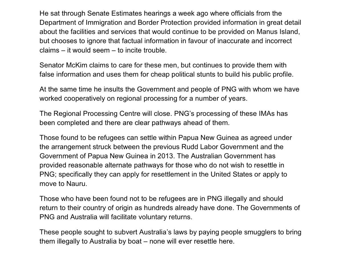 Immigration Minister @PeterDutton_MP has this afternoon issued a statement on the closure of Australia's offshore detention centre on #Manuspic.twitter.com/UQ8UpUN6bG
