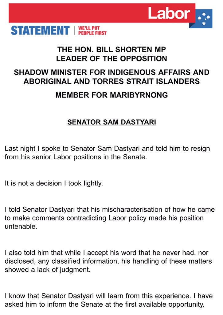 Bill Shorten tells Sam Dastyari to quit senior positions in the upper house as the embattled senator faces questions about dealings with China. Here's the statement. #auspol @AAPNewswirepic.twitter.com/gDgCFwAncH