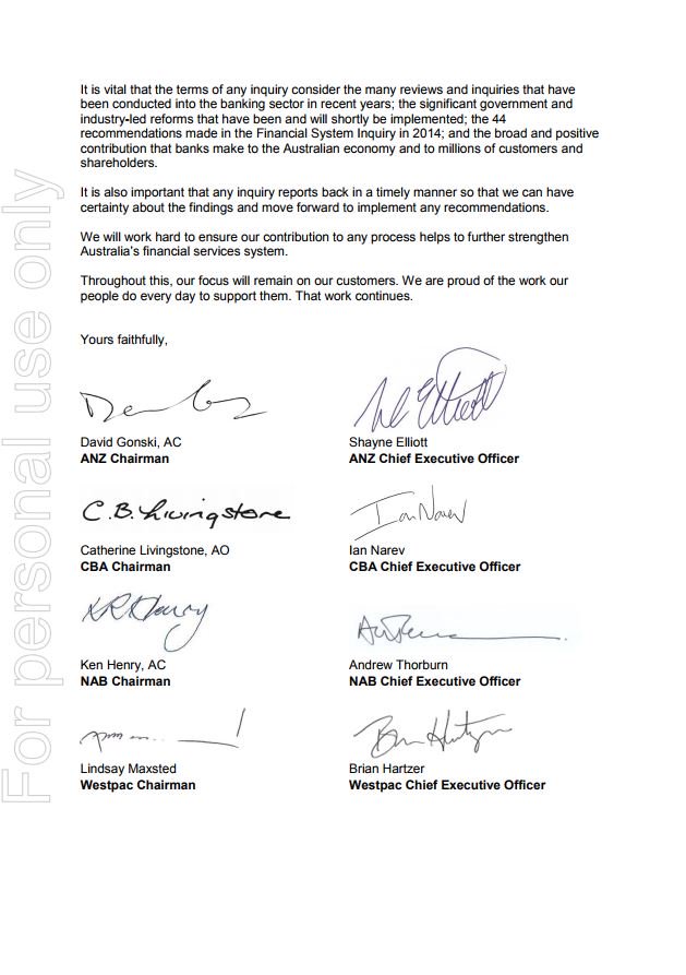 The big four banks have told Turnbull government to set up a "properly constituted inquiry" into the financial services sector. Here's the letter. #auspol @AAPNewswirepic.twitter.com/0pebkt9Qsk