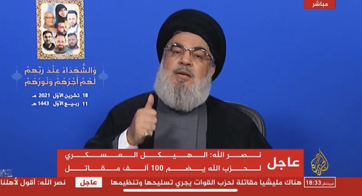 #عاجل/حالياً/أمين عام#حزب_الله حسن نصرالله في كلمة مباشرة يؤكد أن عديد الهيكل العسكري لمقاتلي الحزب يضم 100 ألف مقاتل-وأن الحزب "أقوى من أي وقت مضى" والمستهدف الأول في#لبنان هو حزب الله.