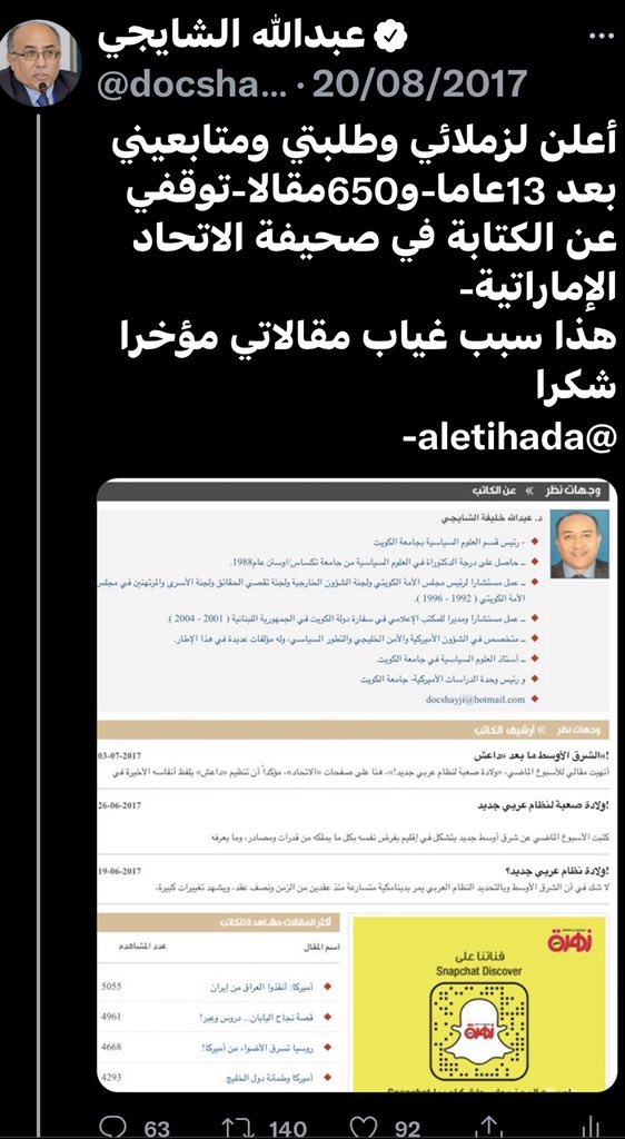 فوجئت عندما أرسل لي مساعدي اليوم أرشيف مقالاتي في صحيفة الاتحاد الإماراتية التي توقفت عن الكتابة فيها في يوليو 2017 مع #الأزمة_الخليجية بعدما توقفت عن نشر مقالاتي في وجهات نظر دون إبداء الأسباب