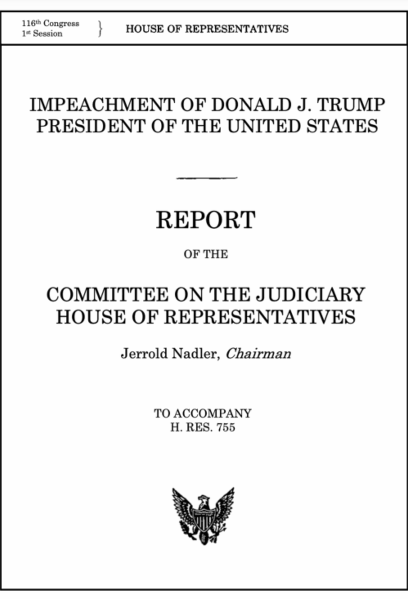 @HouseJudiciary released this 658-page report: IMPEACHMENT OF DONALD J. TRUMP PRESIDENT OF THE UNITED STATES REPORT OF THE COMMITTEE ON THE JUDICIARY HOUSE OF REPRESENTATIVES https://www.documentcloud.org/documents/6578390-CRPT-116hrpt346.html …pic.twitter.com/IM1Cdupj2p