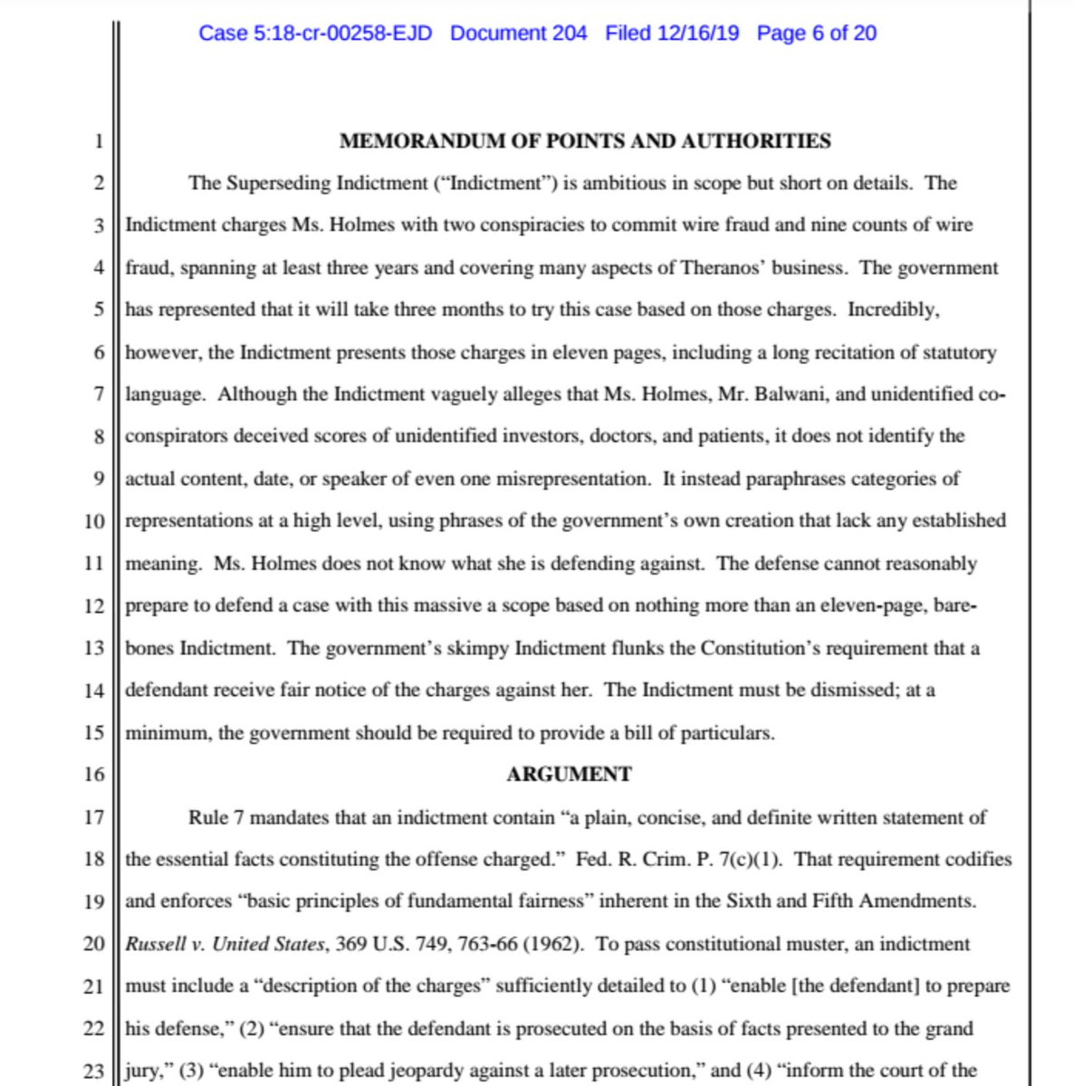 Lawyers for Theranos founder Elizabeth Holmes just submitted a new filing: they want her federal indictment to be dismissed—barring that, a bill of particulars. "Ms. Holmes does not know what she is defending against.” https://www.documentcloud.org/documents/6580655-204-Main.html …pic.twitter.com/aS7nS3FEnJ