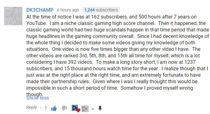 Last week was @YouTube monetization deadline day where #smallyoutubers needed to reach 1000 subscribers and 4k watchtime to stay in the partner program. Here's another success story!pic.twitter.com/5VPmJeopQy