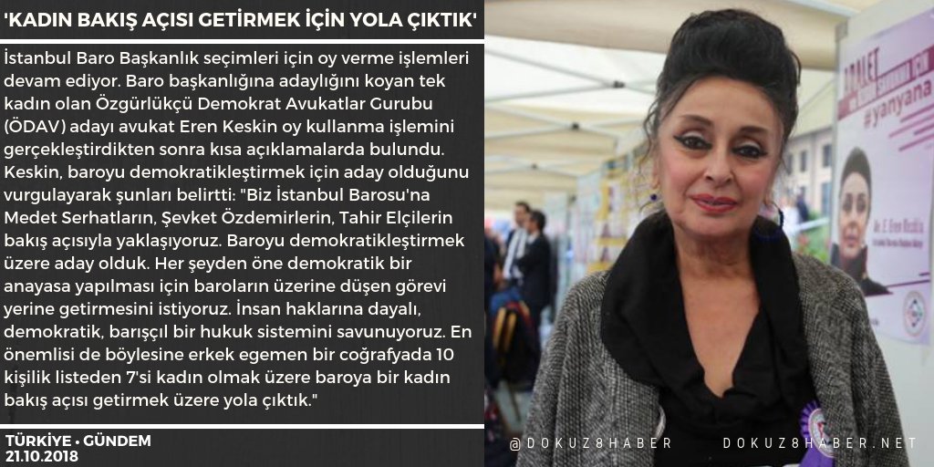 #İstanbulBarosu Genel Kurulu'nda oy verdikten sonra konuşan başkanlık adayı avukat Eren Keskin (@KeskinEren1) "Böylesine erkek egemen bir coğrafyada 10 kişilik listeden 7'si kadın olmak üzere baroya bir kadın bakış açısı getirmek üzere yola çıktık" dedi. via/@Jin__newspic.twitter.com/wtGyNuFVMU