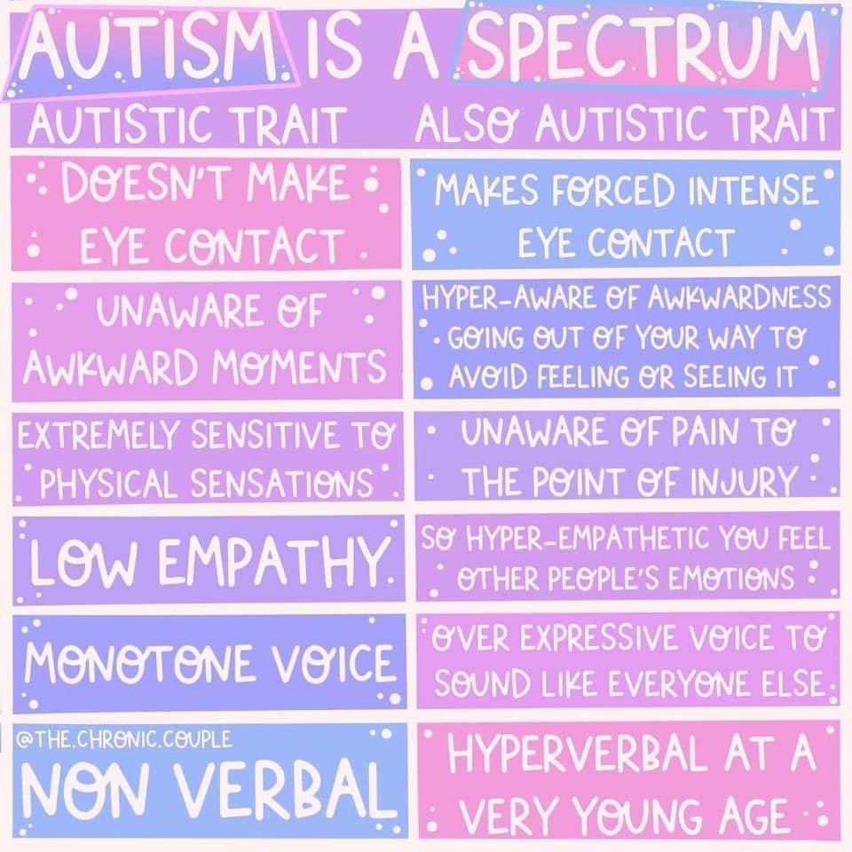 I have all of the traits on the right side! You might be wondering, “How can everything here be considered autism when they contradict themselves?” Well, that’s why it’s called a spectrum.