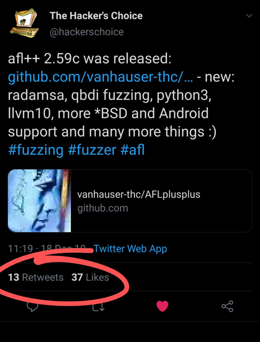 afl++ 2.59c was released: https://github.com/vanhauser-thc/AFLplusplus/releases/tag/2.59c … - new: radamsa, qbdi fuzzing, python3, llvm10, more *BSD and Android support and many more things :) #fuzzing #fuzzer #afl