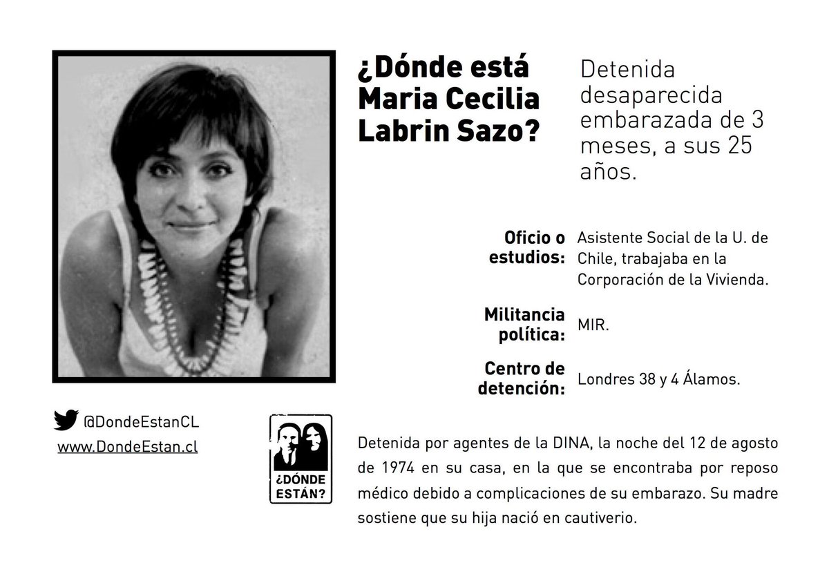 ¿Dónde está María Cecilia Labrin Sazo? Detenida desaparecida el 12 de agosto de 1974, a sus 25 años. Embarazada de 3 meses.pic.twitter.com/KOuIY0nrFB