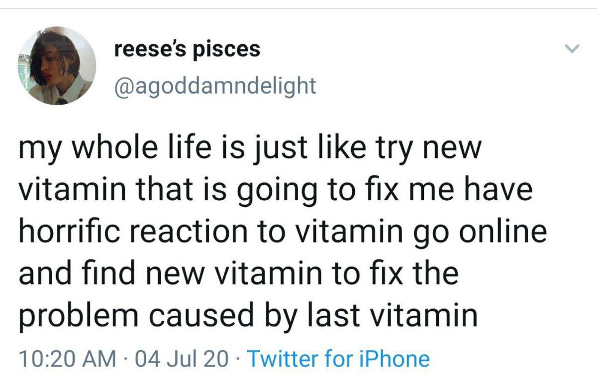 my whole life is just like try new vitamin that is going to fix me have horrific reaction to vitamin go online and find new vitamin to fix the problem caused by last vitamin