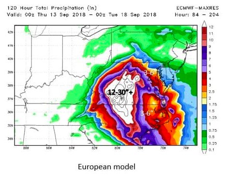 Up to 30" of rain smack in the middle of Virginia... #HurricaneFlorencepic.twitter.com/NOmO7yjy1k