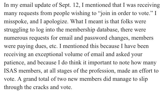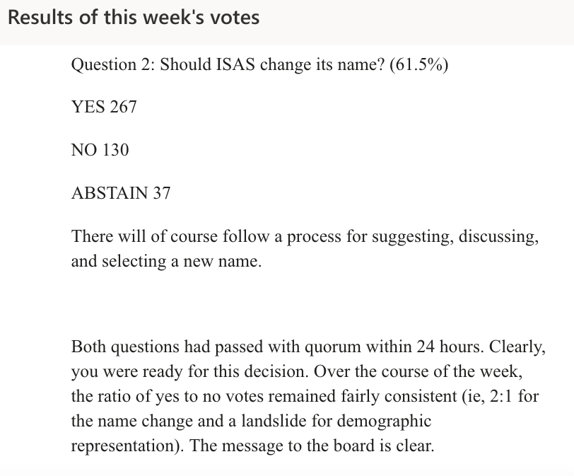 Both ISAS votes passed! "The Society," as it's now somewhat ominously called, will change its name & the board will be expanded. This is great, but as @ISASaxonists reminds us, this was just the first and lowest bar; now it's time to really roll up our sleeves. #medievaltwitter