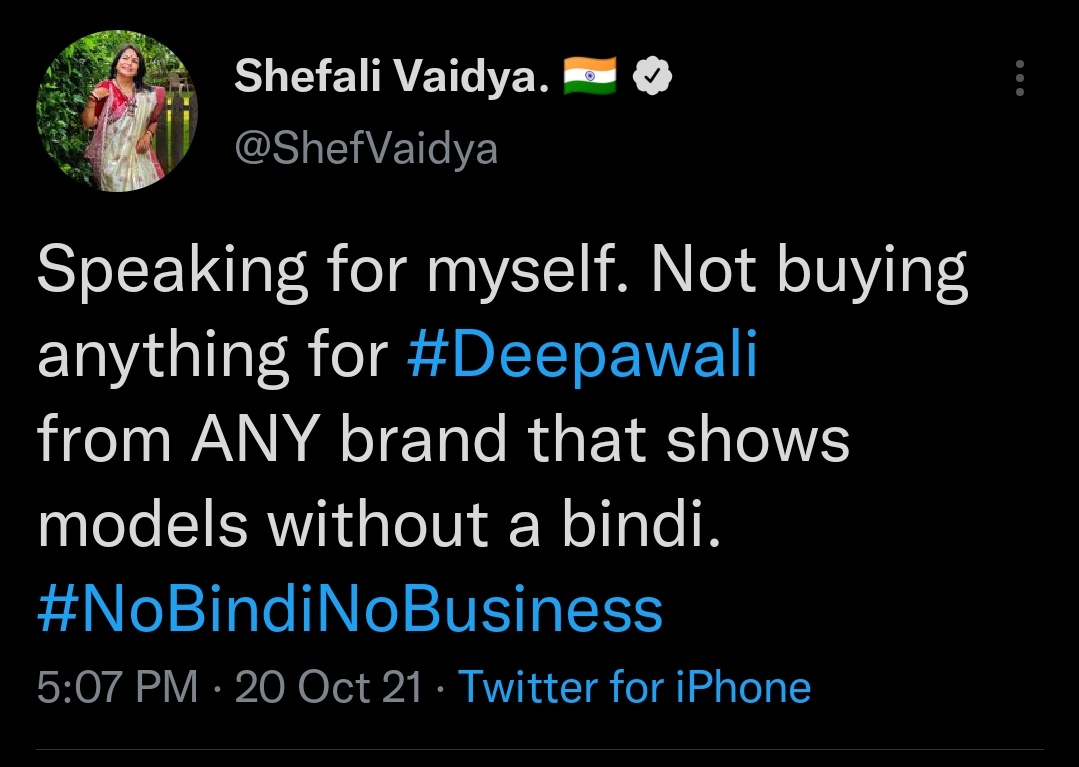 #EaseOfSpoilingBusiness Sanghi Shefali Vaidya attends a meeting of Handloom promotion committee with the textile minister and two days later posts a call for boycotting#Fabindia for having models without Bindi in their ad...https://twitter.com/zoo_bear/status/1450961537259098112 …