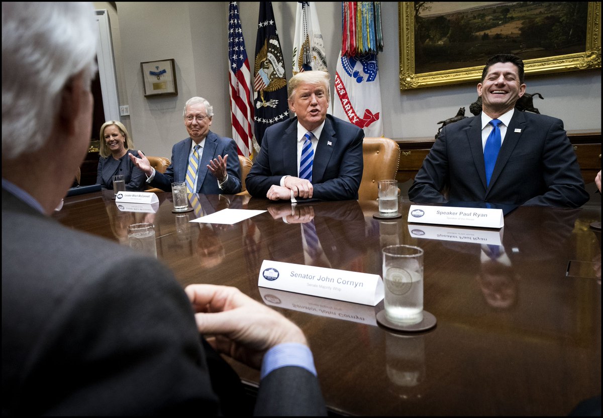 @realDonaldTrump shares a light moment with@SenateMajLdr &@SpeakerRyan during a GOP Leadership meeting at the White House.pic.twitter.com/oWzx2HGa4a