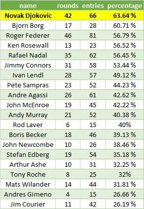 Novak Djokovic has reached 42 SFs on 66 appearances in Slams: 63.64%. This is an Open Era record