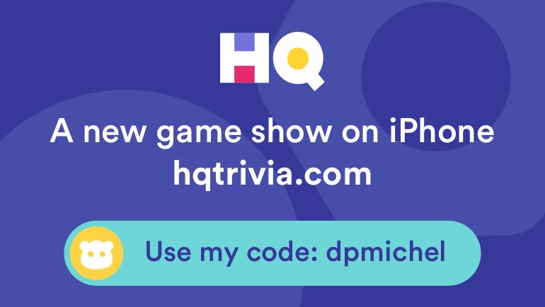 @KrisSmythKnits got me hooked I’m playing a game called@hqtrivia! You should play too. Use my code ‘dpmichel’ to sign up https://get.hqtrivia.com pic.twitter.com/t1JqaZk76o