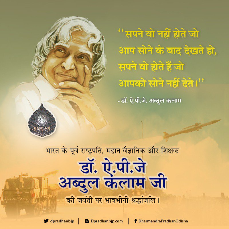 युवाओं के प्रेरणास्त्रोत महान वैज्ञानिक, मिसाइल मैन, भारत रत्न डा० ए पी जे अब्दुल कलाम जी की जयंती पर उन्हें शत् शत् नमन।।