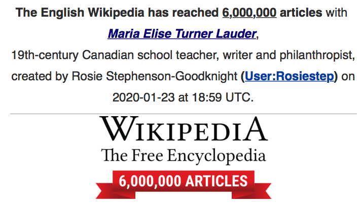 @Rosiestep who created the 6 millionth article in English@Wikipedia - a bio of Maria Elise Turner Lauder, 19th-cent. Canadian school teacher, writer, philanthropist. A big win for@WikiWomenInRed addressing Wikipedia's gender gap https://en.wikipedia.org/wiki/Wikipedia:Six_million_articles …pic.twitter.com/aVeeVcMsGa