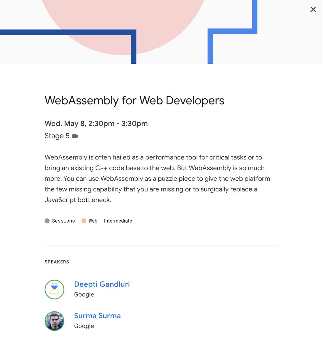 @dptig and I will talk about WebAssembly at#io2019. Hope to see you there (or on the live stream!) https://events.google.com/io/schedule/events/faf395cf-4c2e-4b8e-8e43-b8eb5a16c103 …pic.twitter.com/jCIyf7YyuI