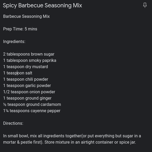 Did the thing. Spicy Barbecue Seasoning Mix Use it as a dry rub, or as popcorn seasoning, or on plain chips to make them bbq. https://pastebin.com/h2EFUsq5 pic.twitter.com/OxlxO4eFxy