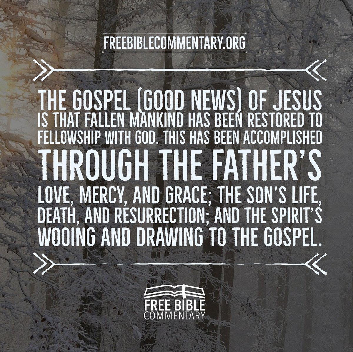 The gospel (good news) of Jesus is that fallen mankind has been restored to fellowship with God. This has been accomplished through the Father's love, mercy, and grace; the Son's life, death, and resurrection; and the Spirit's wooing and drawing to the gospel.