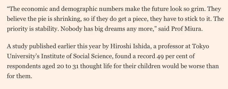 Heartbreaking dejection and hopelessness in this piece about the extreme risk aversion of Japanese young adults (by @Urbandirt, HT @tylercowen): https://on.ft.com/3loDT45  pic.twitter.com/M0w67c43C3